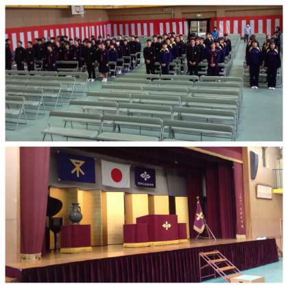 入学式の会場が整い、リハーサルを行いました。あとは新入生を迎えるのみです。式では、新入生を歓迎する「校歌」を、在校生が心を込めて歌います。