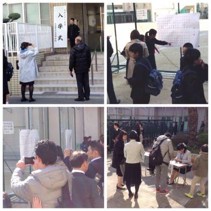 写真は、登校時、学級発表時、入学式、式後の学活などの様子です。