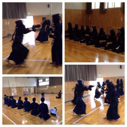 武道場では、剣道部が、心を込めて竹刀で相手に打ち込む、また、相互に打ちつ打たれつ稽古に励んでいます。在校生一同、新入生の入部を心待ちしています。