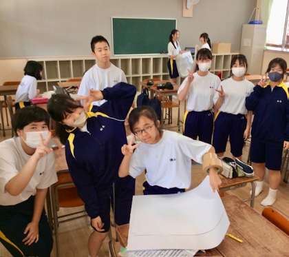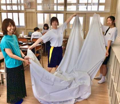 美術部は、学習室に移動して作品作りに励んでいます。中津支援学校との合同作品作りや、菊川モータース様からいただいたテント生地に絵を描くテント画、イラスト画など、部員それぞれが活動していました。
