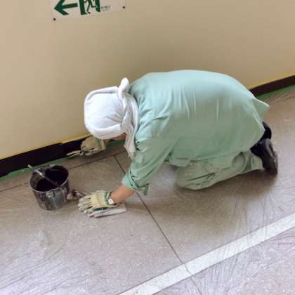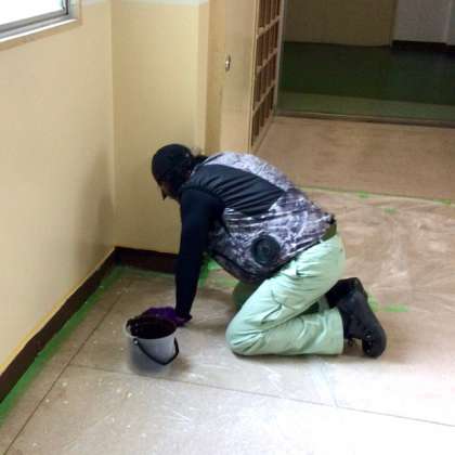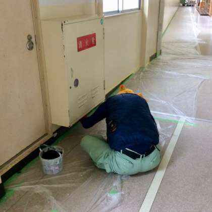 廊下壁面を2度塗りしたあと、今日は巾木部分の塗装をしてくださっています。