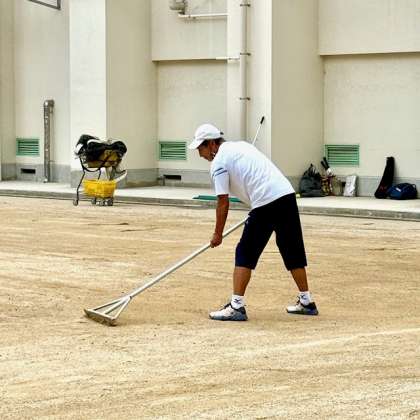 朝のグラウンドです。部活動指導員の福西さんは、いつもテニス部員が登校する前からグラウンド整備をしてくださっています。