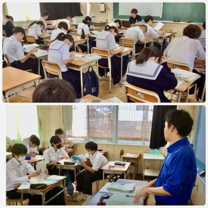 本日、5時間目の授業の様子です。明日からの中間テストを控えて、振り返りをしています。先生からは「明日のテストはここから出ます!」とヒントに食いついていました。