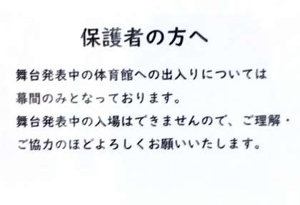 舞台発表中の体育館への出入りは、幕間のみでお願いします。ゆとりを持って来校してください。