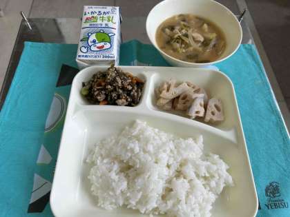 給食のジューシーは、豚ひき肉、にんじん、むきえだまめ、もずく、切りこんぶなど使った、炊き込みご飯風です。ご飯と具を混ぜて食べましょう。