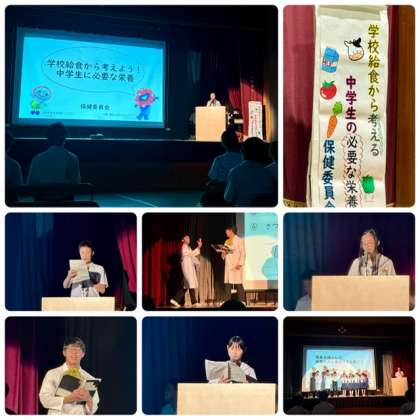 舞台発表1番は、保健委員会の発表です。タイトルは「学校給食から考える中学生の必要な栄養」です。