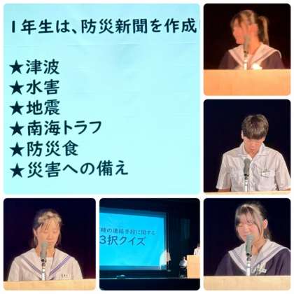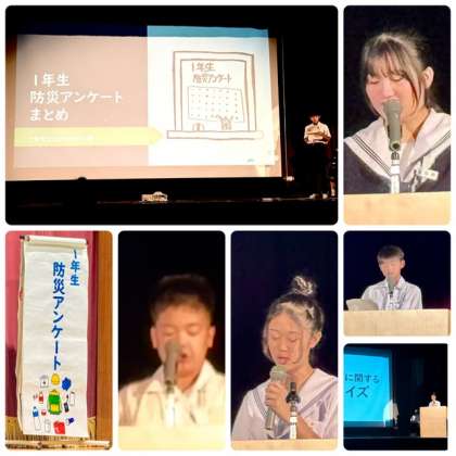 舞台発表2番は、1年生の発表です。タイトルは「防災アンケート」です。