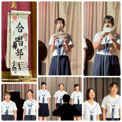 午前中のトリは、合唱部の皆さんです。少人数ながら数々のコンクールや地域のコンサートでも、評価が高い合唱部です。