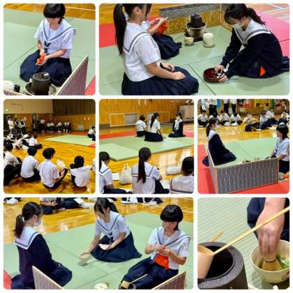 茶道部お点前と、各学級の体育大会応援旗の展示です。