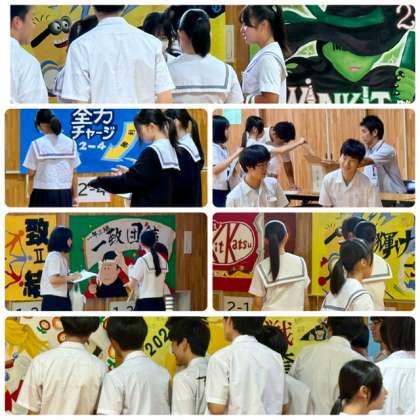 応援旗は今月31日(金)に開催する体育大会で使用するものです。文化祭で披露し、コンテスト形式で優秀作の投票も行っています。どのクラスも創意工夫に溢れ力作が勢揃いしています。