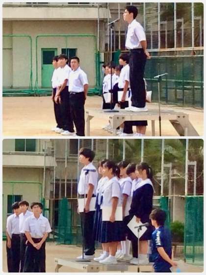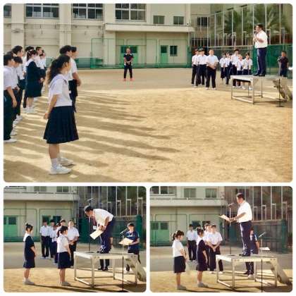 校長先生からは「よろしくお願いします。」と言葉をかけられました。また「全校生徒の信託を受けて選出された責任をまっとうして、より素晴らしい大淀中学校にしてください。」と激励の言葉をかけられました。また、全校生徒に対して「皆さんが選出した役員です。しっかり協力してください。」とお話されました。前期生徒会会長の足立亮さんからは、感謝の言葉が、新会長の杉本唯さんからは、よろしくお願いします。と挨拶しました。