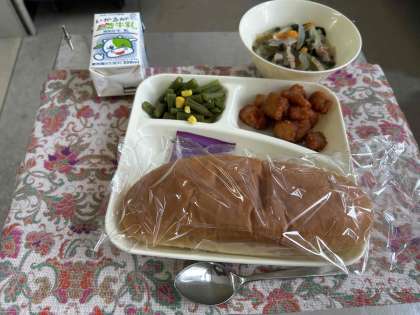 今日は、まぐろを油で揚げて、ケチャップと赤味噌、砂糖を混ぜて作ったちれをからめたまぐろのオーロラ煮が出ます。