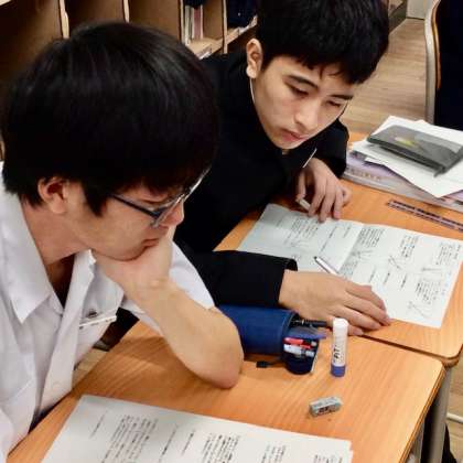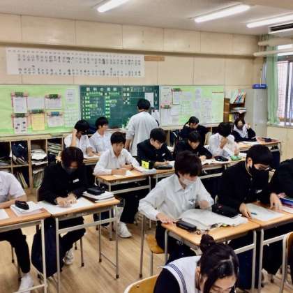 3年2組は数学の授業です。関数の問題演習を行なっています。山田先生型グループ学習で、互いに教え合いをしながら学習を深めています。