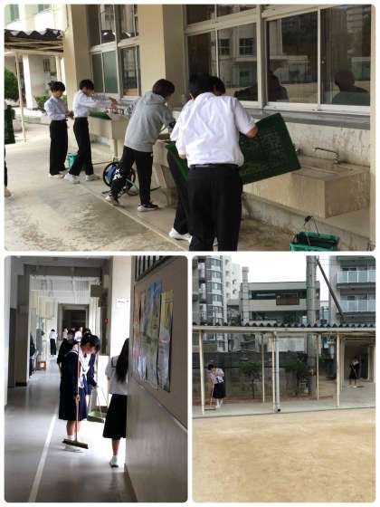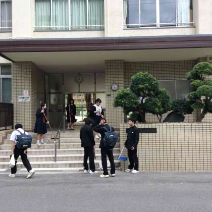 担当生徒が8時時までに登校し、正門玄関、職員室前から格技棟までの渡り廊下、東門付近を清掃してくれました。