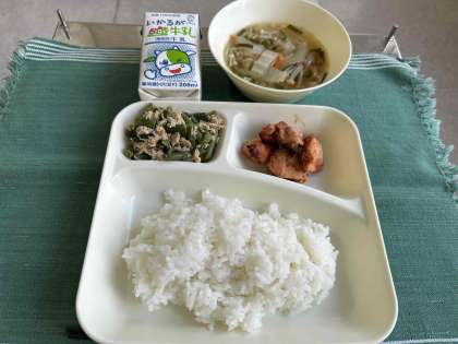 給食では、しょうが汁、にんにく、砂糖、塩、こいくちしょうゆ、ケチャップ、トウバンジャンを混ぜ合わせて作っています。