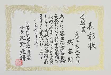 銭 容朗さんは奨励賞をいただきました。以下に、日本語訳を掲載します。