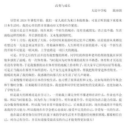しかし、最大の困難はやはり学習面でした。最初は授業で先生が何を話しているのか全く理解できず、宿題もできませんでした。そのため当時はとても焦りました。3年生として来年は進学を控えているのに、語学力に限界があり、成績を上げるのが困難だったからです。当時は自分自身を受け入れられず、自分の成績に非常に不満を抱き、しばらくの間自己否定感に陥りました。その後、徐々に自分を受け入れるようになりました。なぜなら、今の成績が必ずしも学習能力を反映しているわけではないこと、新しい環境に適応するには時間がかかるのは当然のことなのです。今でば気持ちが落ち着き、完璧ではない自分を受け入れ、毎日を大切に過ごすように努めています。