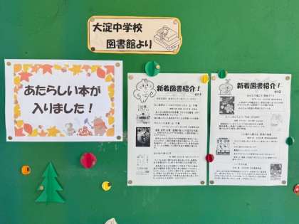 職員室前の掲示板に図書館に新しい本が入ったと掲示されています。テストが終わったら図書館に行きましょう。