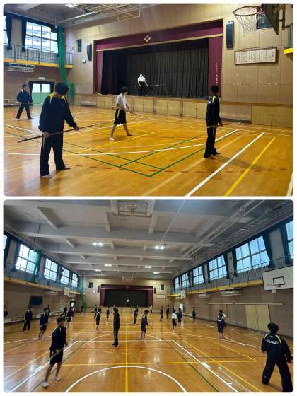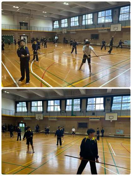 全日本なぎなた連盟から講師をお招きし、授業を行なっています。動きを丁寧に教えていただき、生徒は一生懸命ついていっていました。