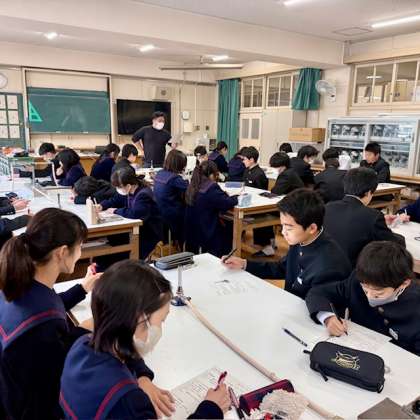 第1理科室で1年2組が理科の授業を受けています。野崎先生の指導に集中して聞いています。