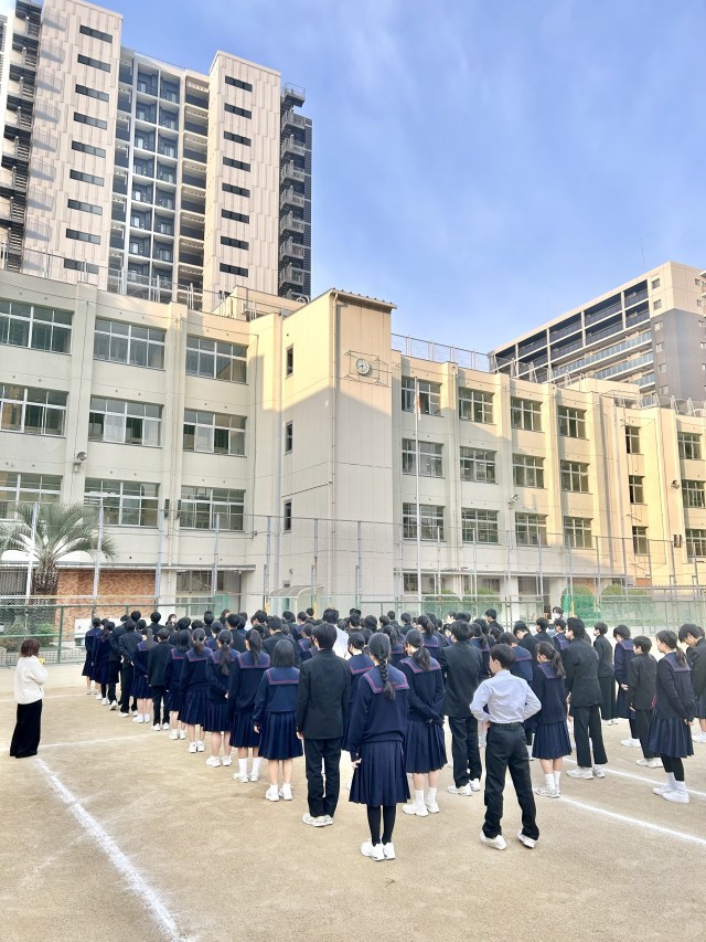 おはようございます。今朝は、グラウンドで2年生が学年集会を行なっています。