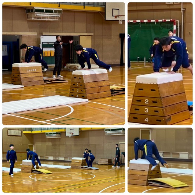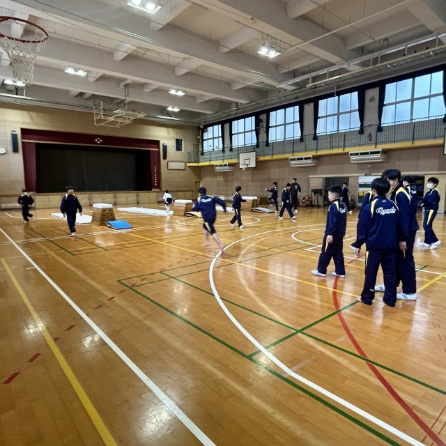 体育館では、1年1組男子が跳び箱の学習をしていました。片付けも、協力して片付けていました。寒さ知らずですね。