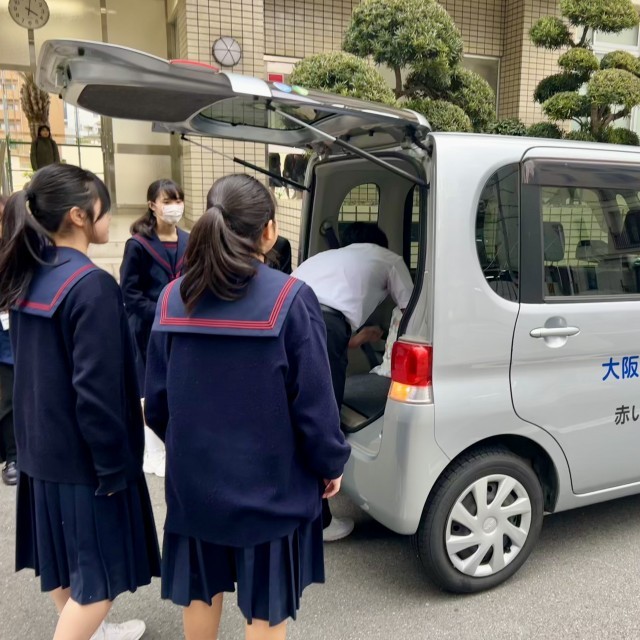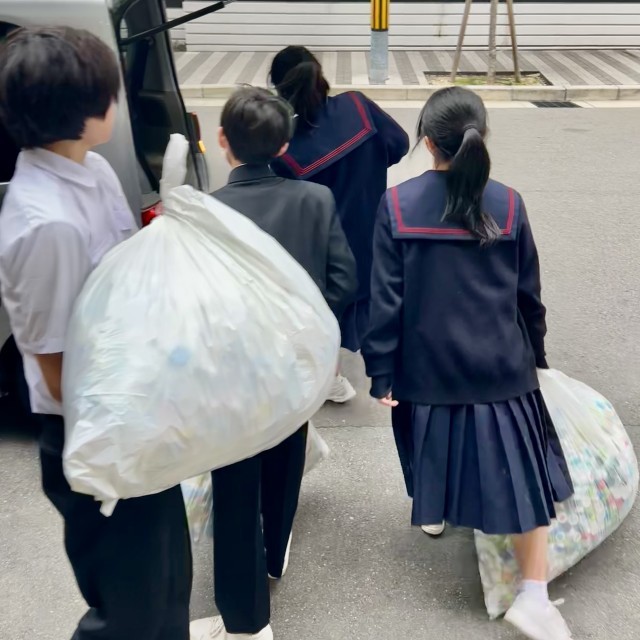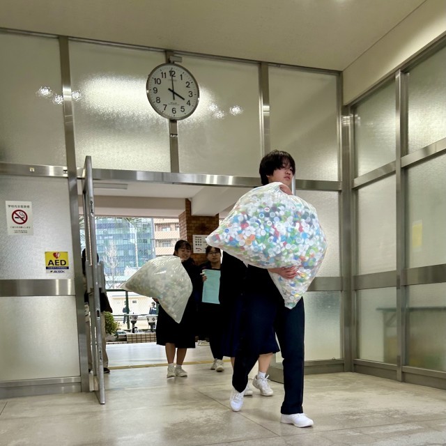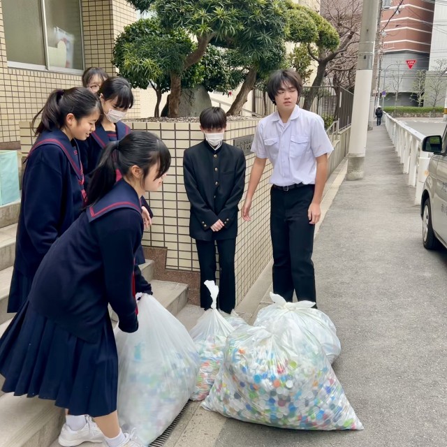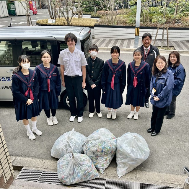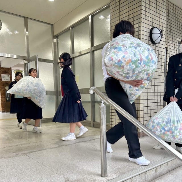 2月16日(月)放課後、北区社会福祉協議会の皆様に、生徒会が全校生徒に呼びかけて集めた「ペットボトルキャップ」を回収に来てくださいました。
