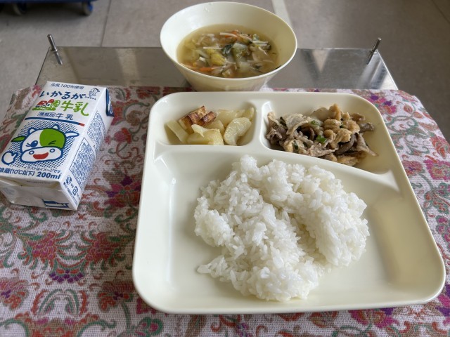 今日の給食では、豚肉と干しずいきのみそ煮に使われています。