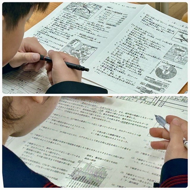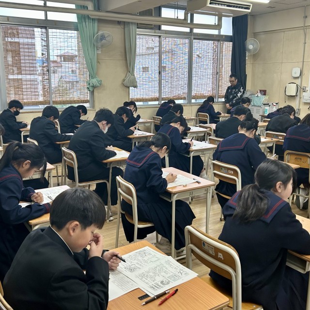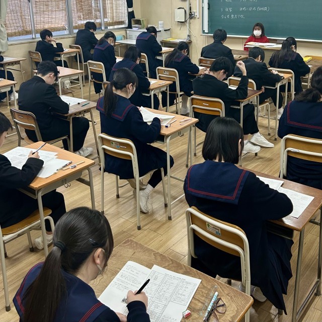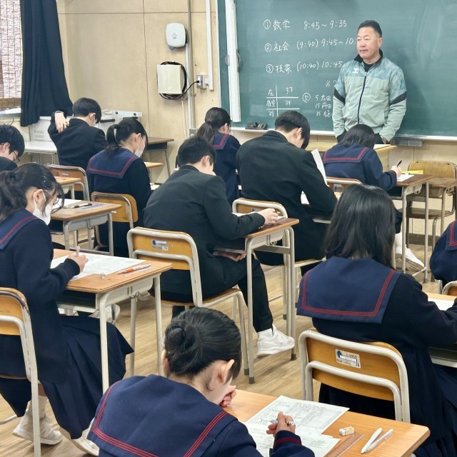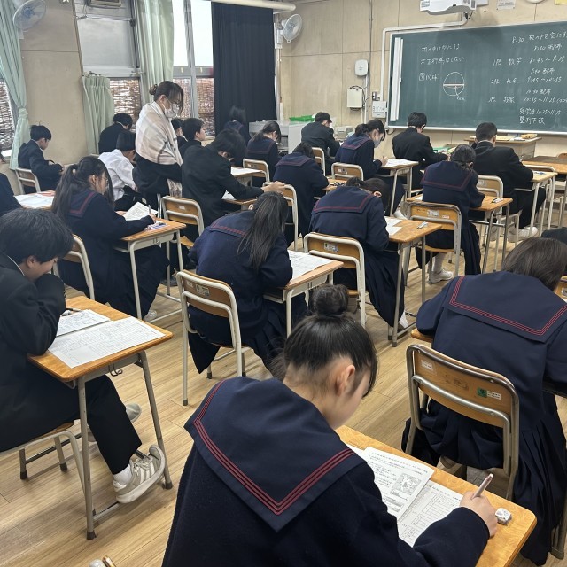 今日から3日間、1・2年生は学年末テストです。第1日目は、数学、社会、技・家の時間割です。