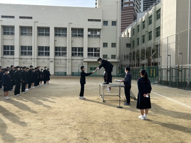 まず大淀中学校として、大阪市よりむし歯や歯周病疾患の管理に努力が認められ、表彰を受けました。保健委員会の代表生徒に授与してもらいました。