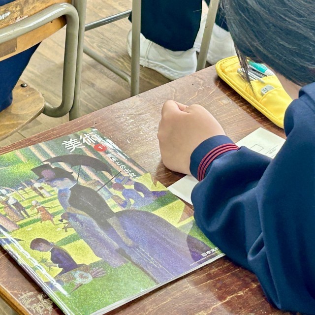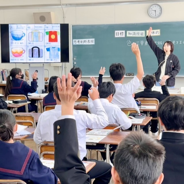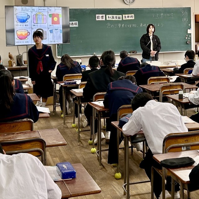 1年3組は美術科の授業です。山田知可子先生はICT機器を活用してわかりやすく教えてくださっています。生徒は真剣に学んでいます。