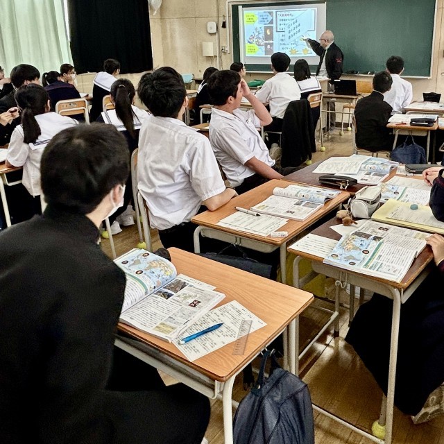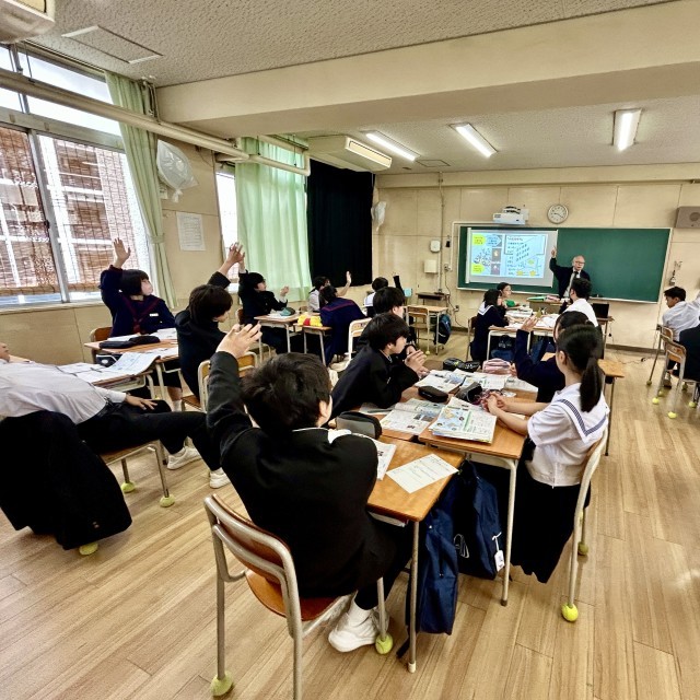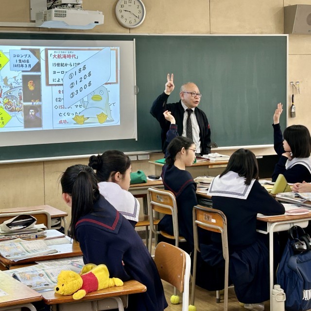 2年4組は社会科田中邦勝先生の授業です。班学習で授業が進められています。教科書の内容をわかりやすくPowerPointで解説してくださいます。田中先生の発問に、積極的に手をあげて参加しています。