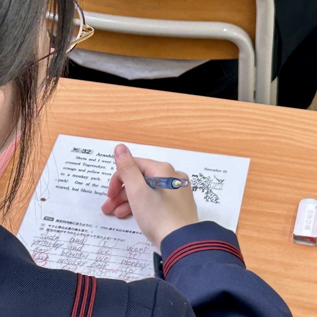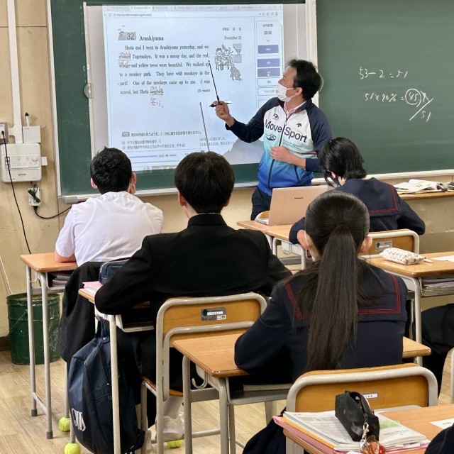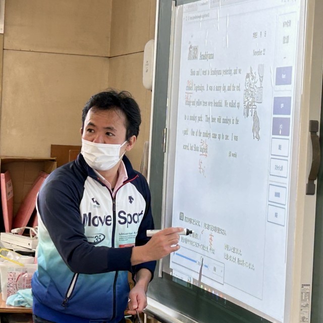 3年4組 英語の授業の様子です。中垣先生が電子黒板を使って学習を進めています。デジタル教科書の画面に直接書き込んでいます。とてもわかりやすいようです。