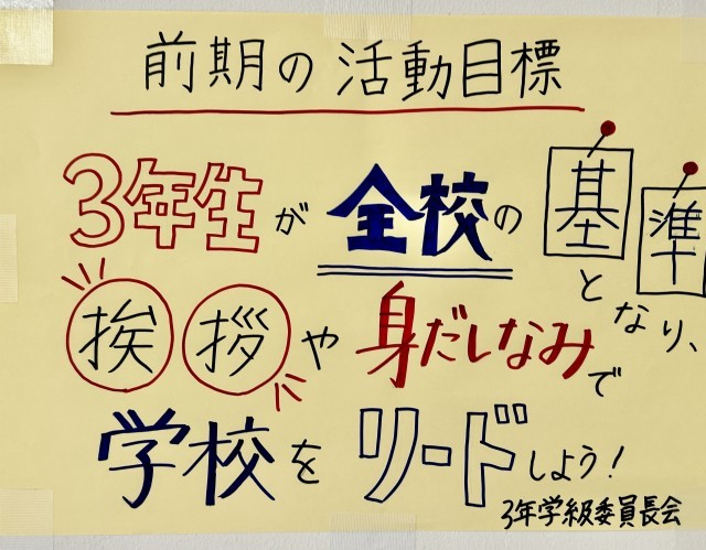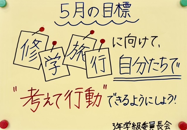 写真は3年生掲示板に貼られていた、前期の3年生の目標と、5月の目標です。さすが3年生、最高学年としての自覚とブライトが見て取れます。