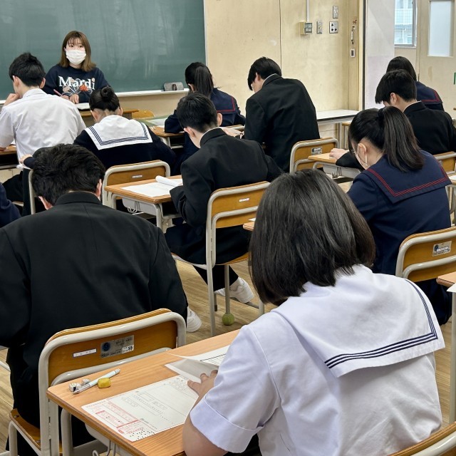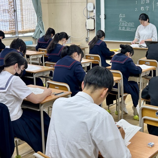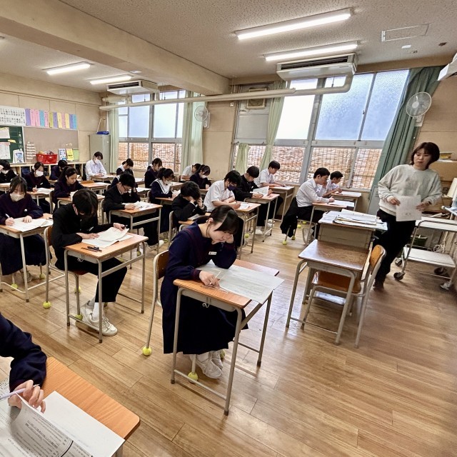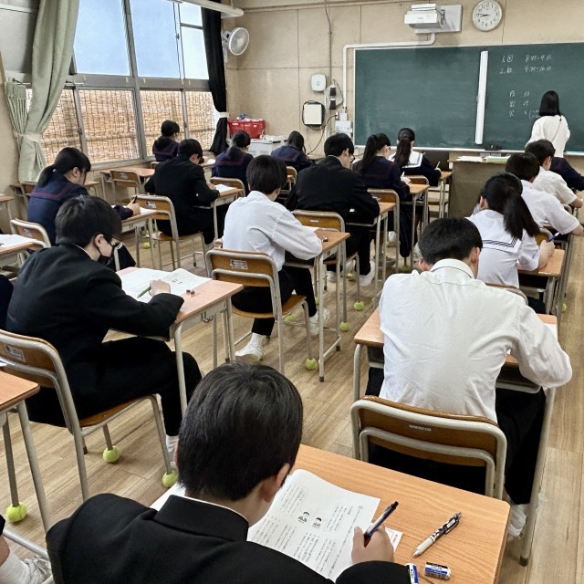 1時間目に国語、2時間目に数学、午後から2時間かけて、C BT方式(パソコンを使ったオンライン)で英語「書くこと」「書くこと」「書くこと」のテストと「生徒質問調査」を受けます。