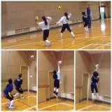 体育館では、バレーボール部が、広いスペースを使いつつ、壁に向かって基本練習を繰...