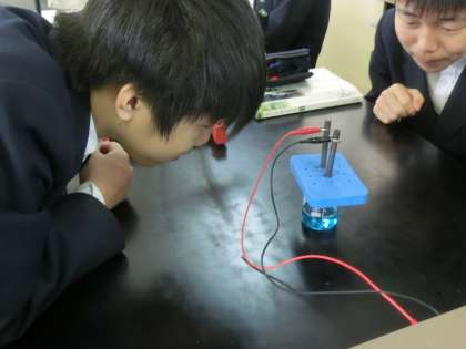 陰極と陽極でのそれぞれの変化の違いを確認しました。できた固体を磨いたり、発生した気体のにおいからプールのにおいがしたことにより、各自で考察を行い、実験班で話し合いに取り組みました。
