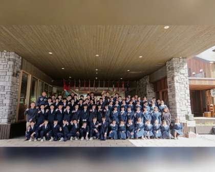 最後にホテルの玄関で学年全体の集合写真を撮って出発。