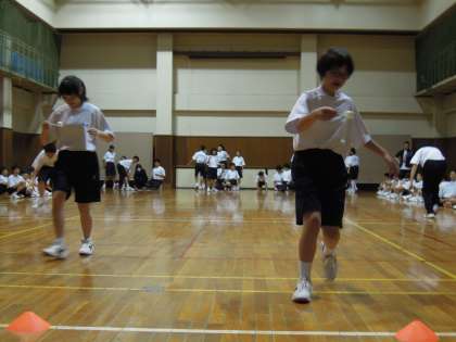 お玉・スプーン・紙皿・割りばしの順でピン球を運びます。