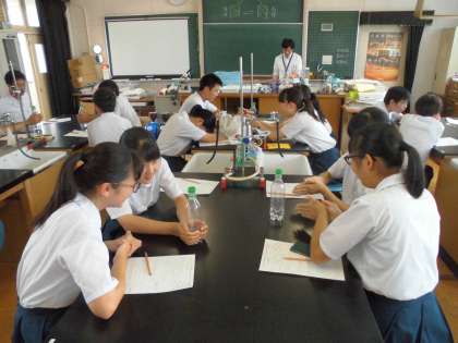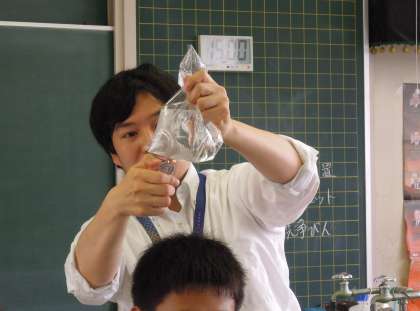写真は、水の入ったビニール袋の下からライターで火をつける実験です。