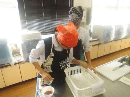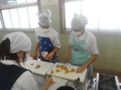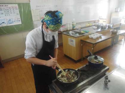 炒める人、切る人、洗い物をする人など、班で協力している姿が