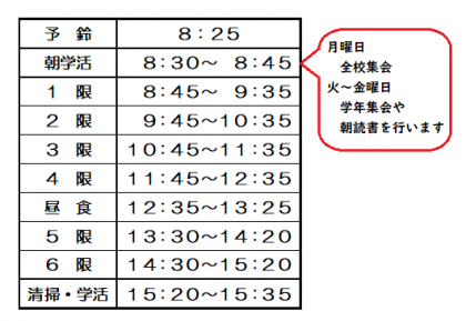 朝は8時25分までに西門から登校し、教室の自分の席に座っておきましょう。
