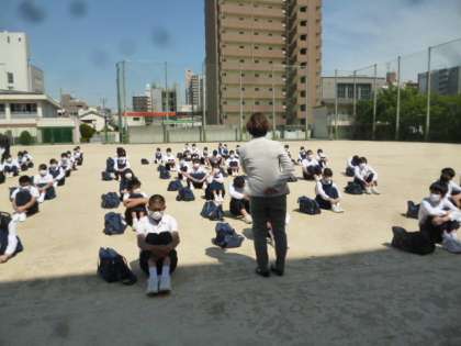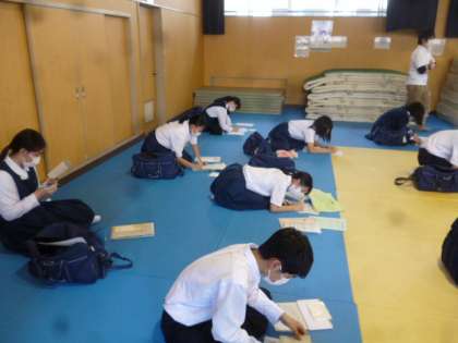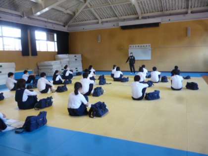 格技室では、1組の学級開きです。新しいメンバーでのスタートからなのか、2か月半のブランクからなのか、みんな、とてもおとなしかった。