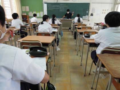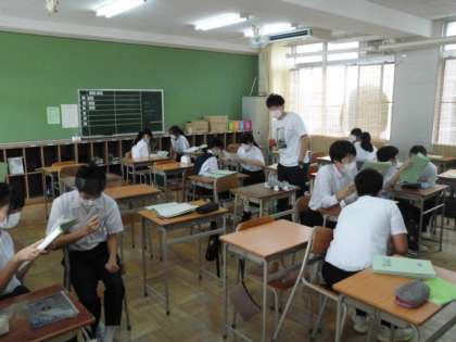 英語の授業では、ニュースでもとりあげられていた手作りのフェイスシールドを使って、ペアワークに取り組んでいました。