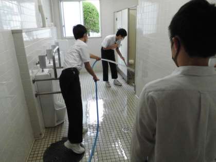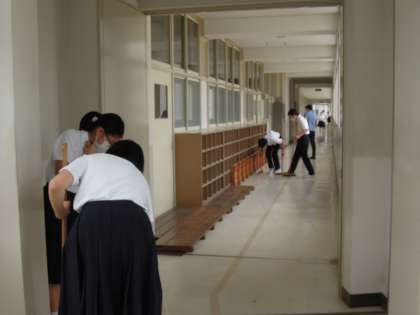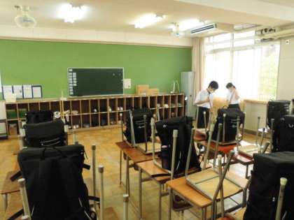 午後に登校している生徒で掃除を行っています。どの学年も少ない人数で協力し、学校中をきれいにしています。