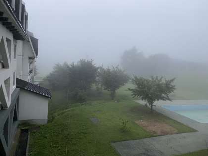 そこで、外を見ると土砂降りの雨。