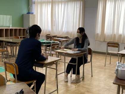 3年生の英語の時間、学習室を使ってC-NETのアン先生がインタビューテストを行っていました。