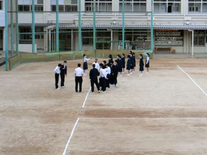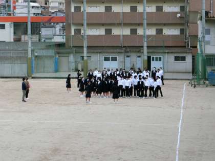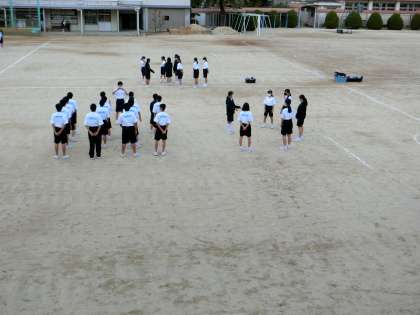 全学年が運動場にて合唱の練習を行っていました。