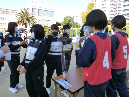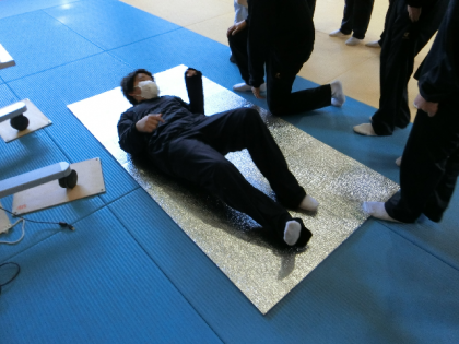 真ん中の写真は避難所での一人あたりの広さを体験している場面です。