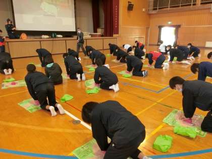 コロナ禍避難者受付体験の様子と、AED・救急救命の様子です。